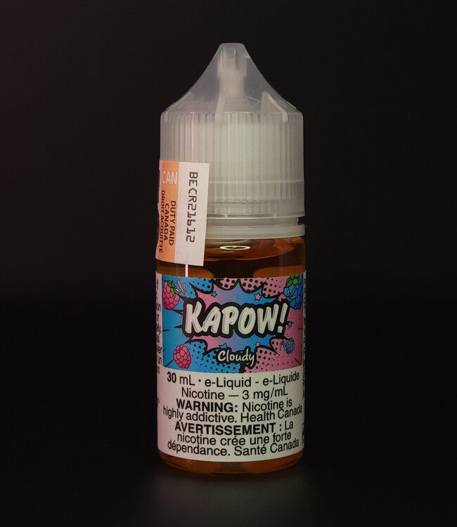 CLOUDY BY KAPOW E-LIQUIDS features a blend of tangy raspberries and ripe strawberries with a sweet twist. Each puff delivers a smooth, layered fruity flavour.